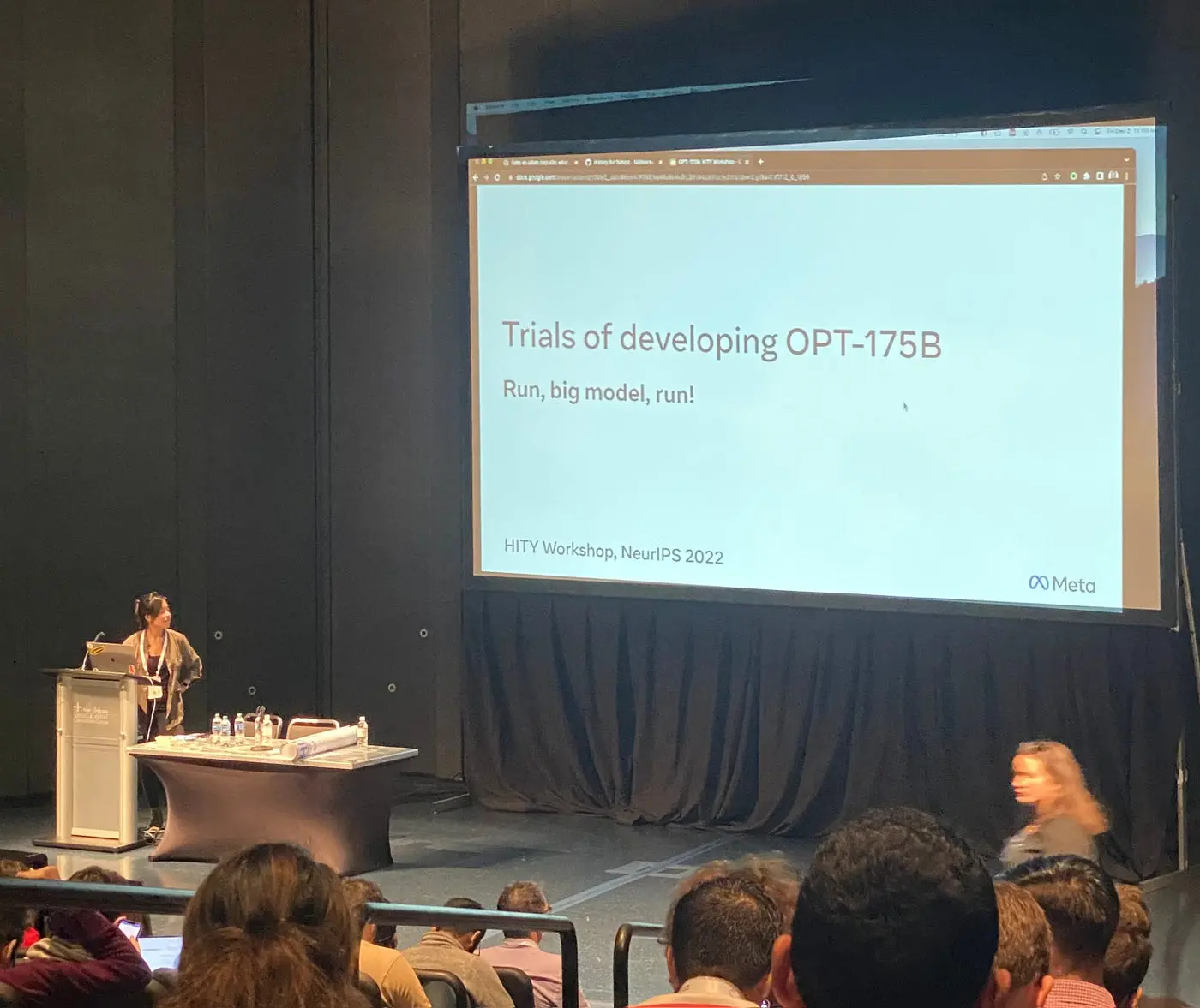 The “Has It Trained Yet (HITY)” workshop↗ provided practical tips for ML researchers to train a large language model. Susan Zhang from Meta AI delivered a series of trials and errors with her intuition behind each experiment while training the OPT-175B language model. The experiment log of training with 1024 A100 GPUs for three months while adjusting hyperparameters and hardware problems was quite intriguing to ML engineers.