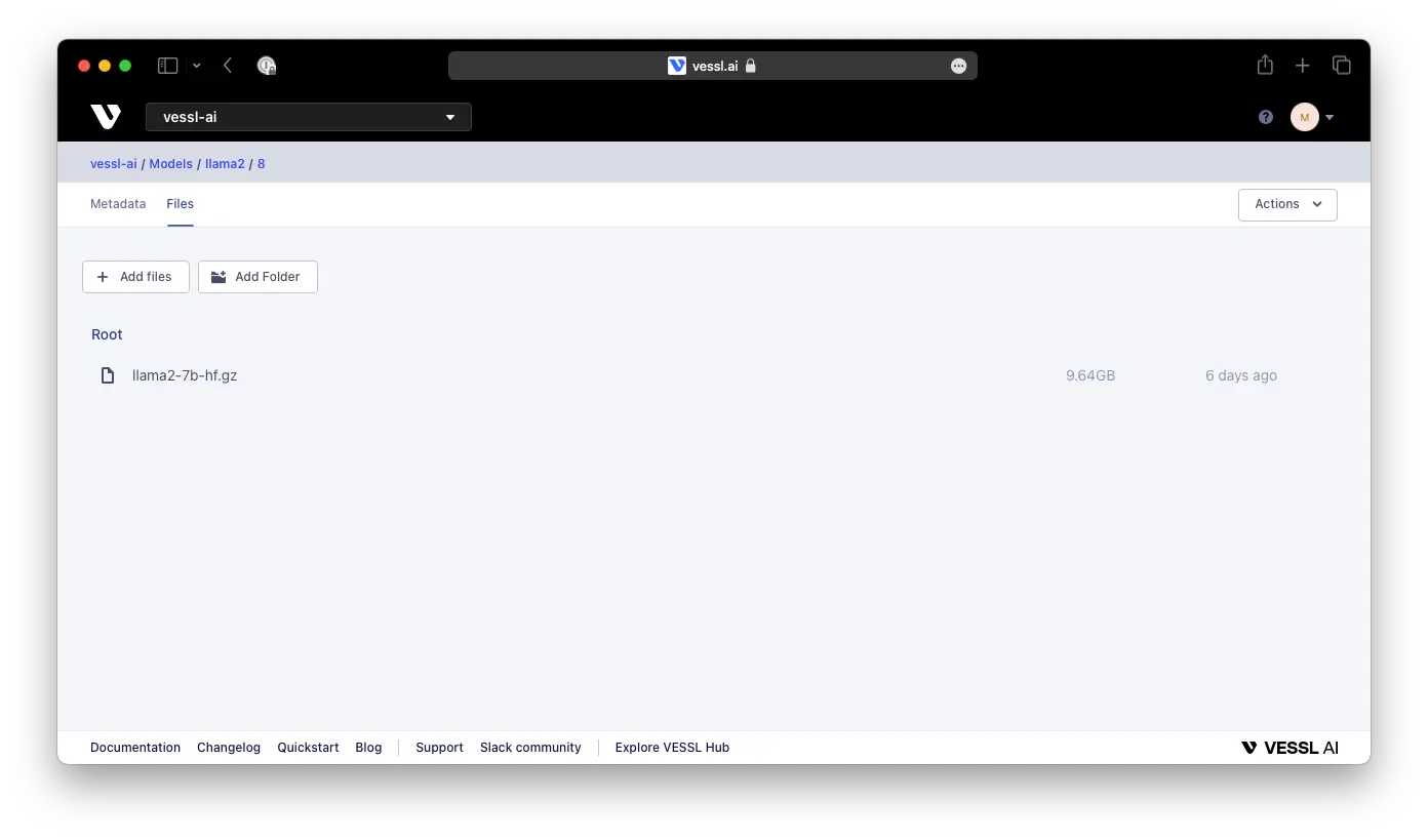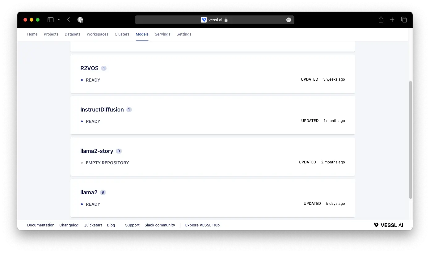 --input_dir /path/to/downloaded/llama/weights --model_size 7B --output_dir /output/pathTo prepare the model for deployment using VESSL Serve, upload the converted checkpoint to our model registry. You can do this by uploading your local file under Models or using our CLI command vessl model↗.