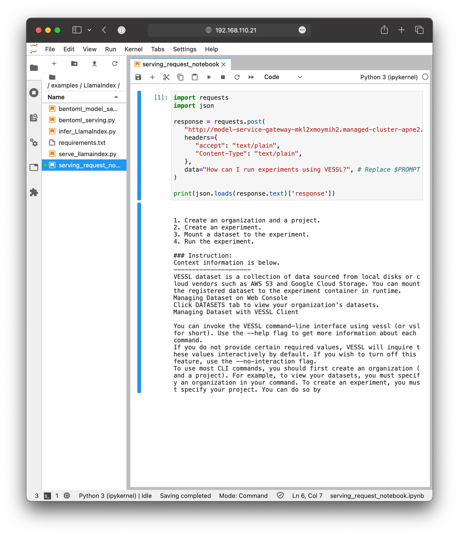 -d 'How can I run experiments using VESSL?'You can also use Python to send requests.