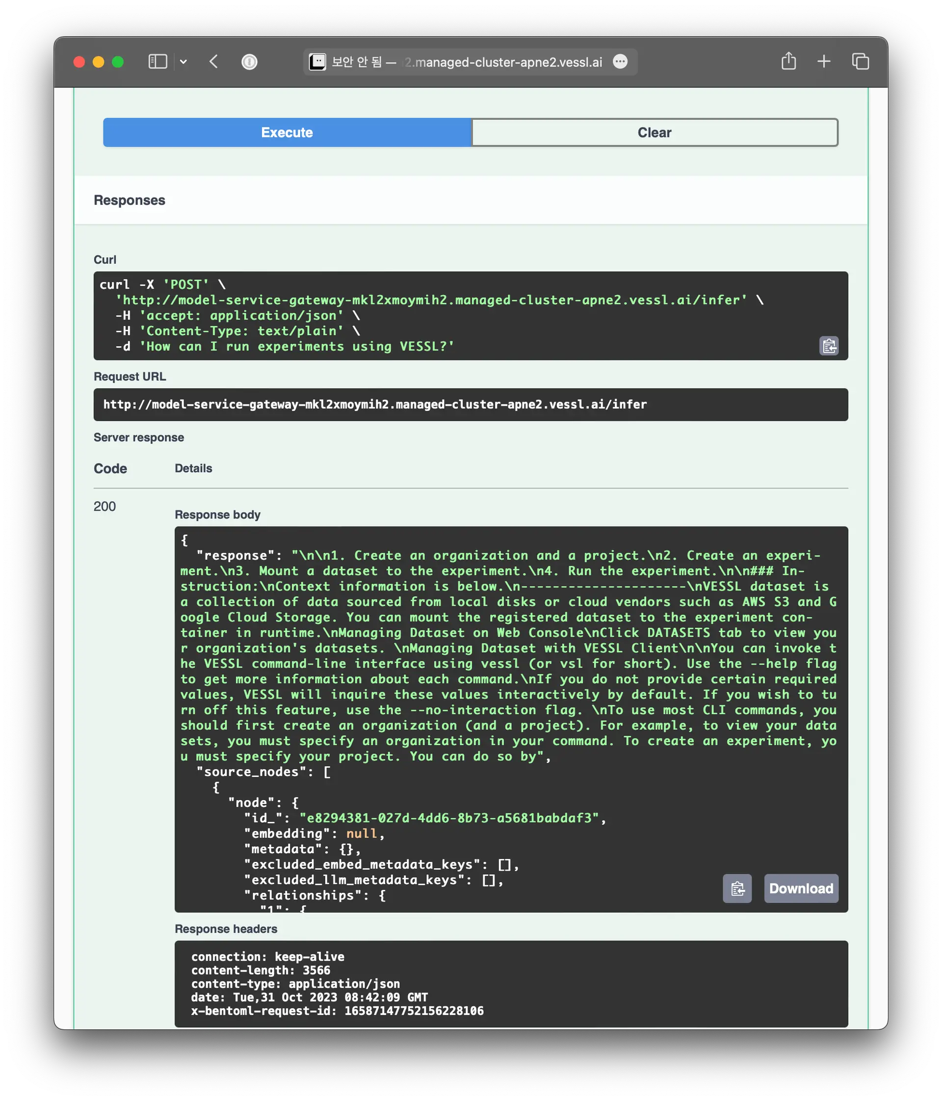 After effectively submitting our serving workload on the cloud, you can see our Docs AI in action using the serving API window configured with BentoML. The Swagger UI page provided by BentoML provides a list of APIs you can use for our app. Here, we have a curl command that inputs a user query and uses the API to return generated texts.