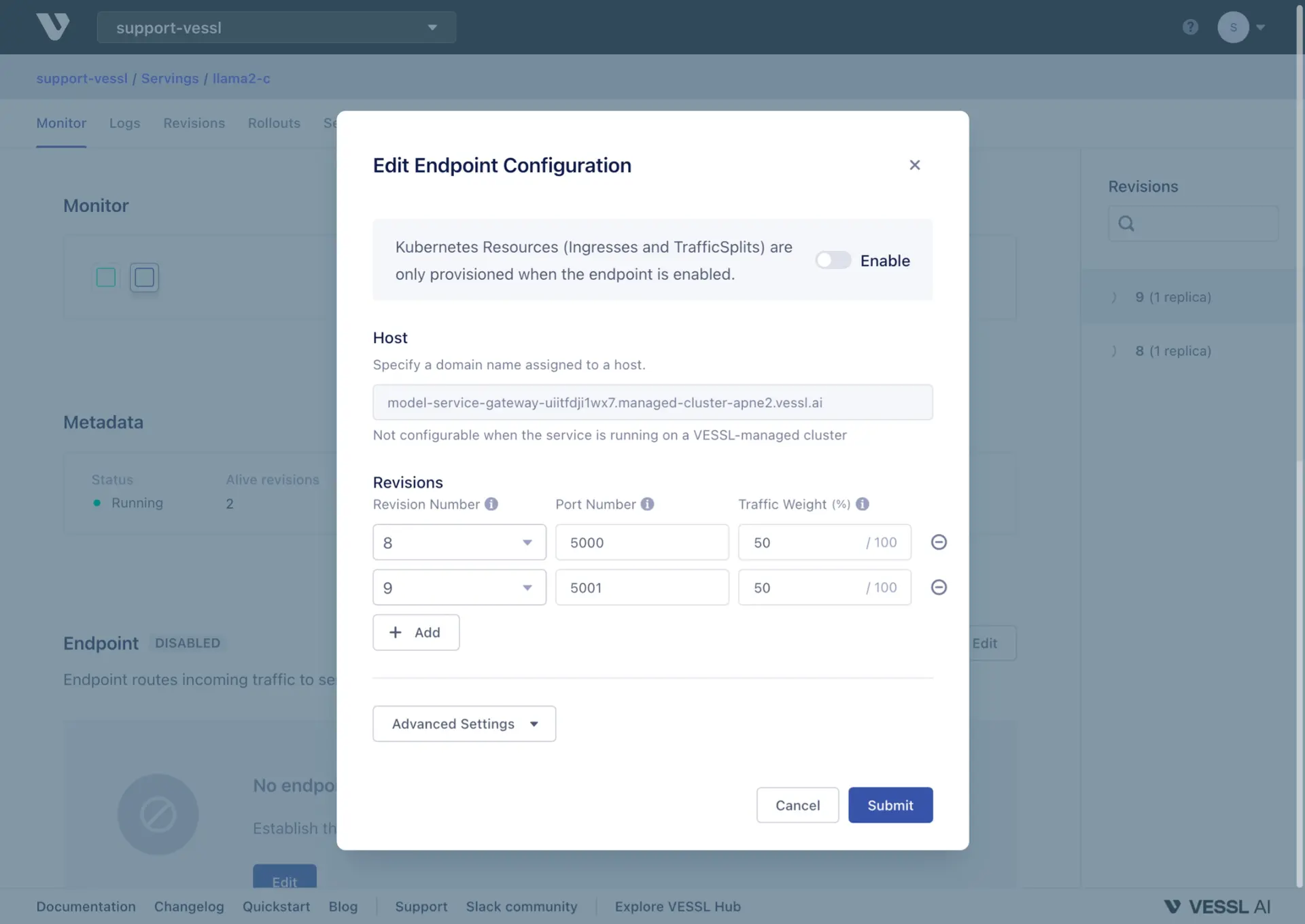 - Expose a port for serving by simply designating a port number. You can also set up multiple ports and allocate traffic to each port, which allows you to A/B test your models. VESSL AI routes incoming traffic to service workloads using Kubernetes Ingress and TrafficSplit.