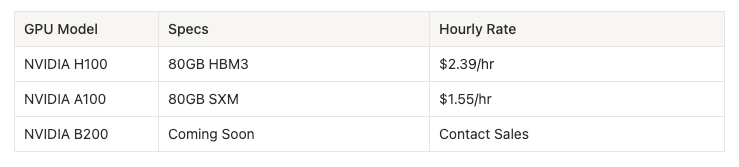 It is a GPU cloud optimized for AI/ML workloads. From LLM fine-tuning to large-scale training and model experimentation. Rent only what you need.