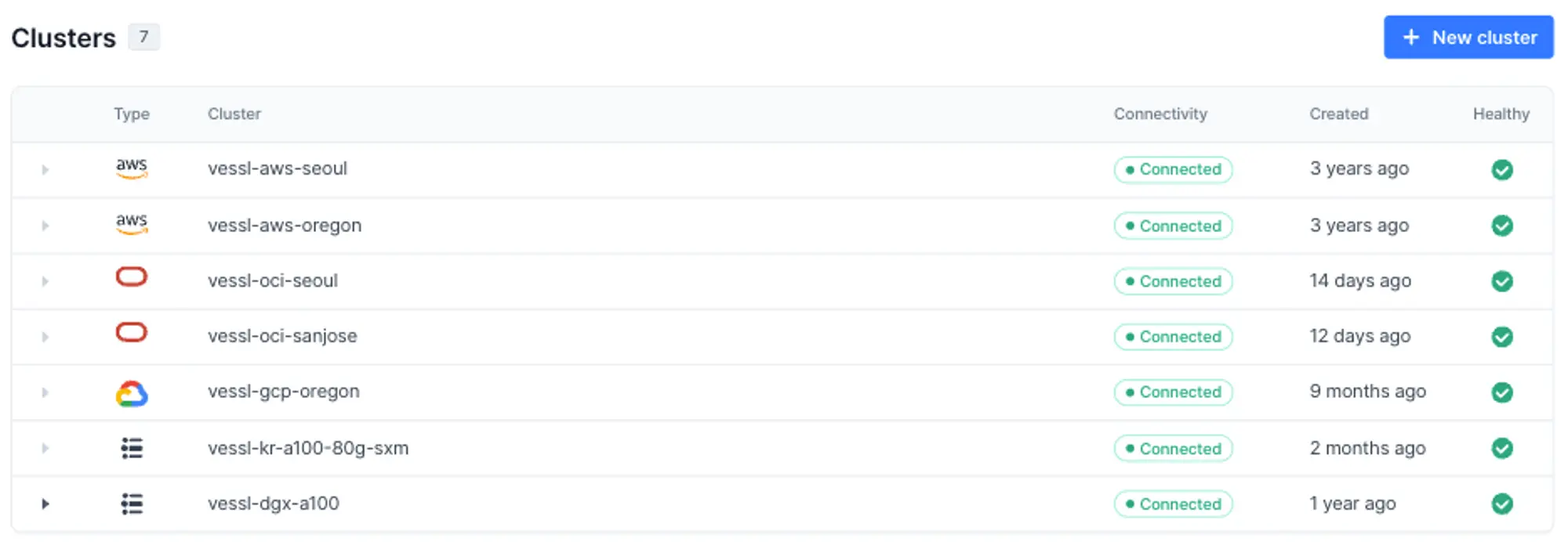 The integrations with OCI have been successfully completed. When visiting app.vessl.ai↗, you can now clearly see the clusters section displaying vessl-oci-seoul, vessl-oci-sanjose.