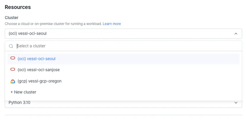 Similarly, in VESSL Run, Workspace, and Service, users can view OCI clusters and apply them to their services.