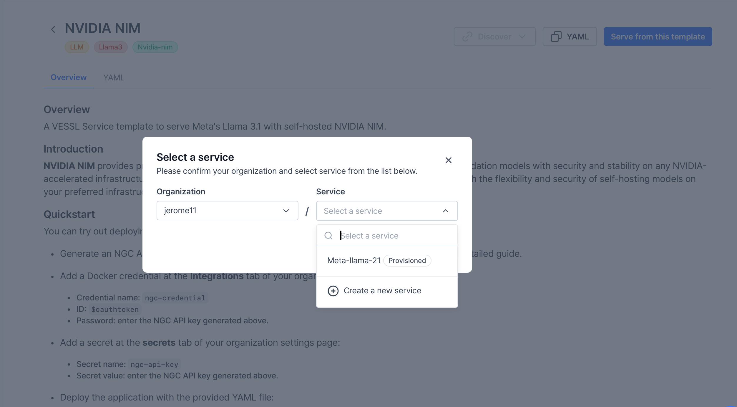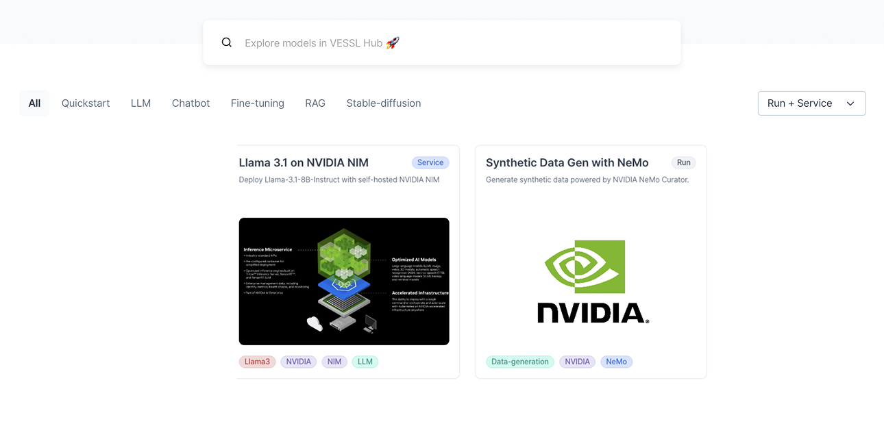 베슬에이아이(VESSL AI)의 VESSL 플랫폼 내에서 NIM & NEMO를 손쉽게 이용하려면, Hub 에 구축된 템플릿으로 간단히 시작해 보세요. Run 또는 Service 기능에서 GUI 만으로 Llama 3.1을 포함한 다양한 LLM 모델을 간단히 배포할 수 있습니다.